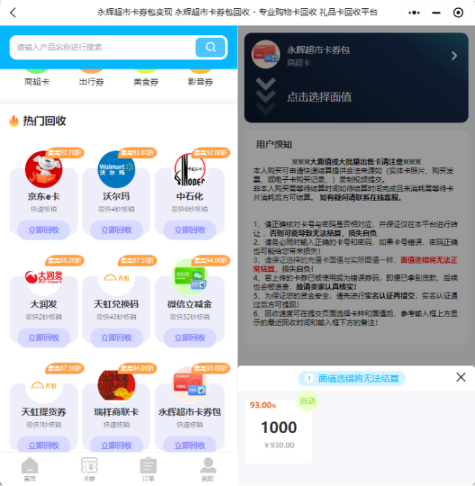 这种组合看似实用,但也有一定的局限性。并不是每个人都需要如此频繁地光顾超市,或者有打车的刚性需求。若卡片闲置,实际上是一种资源的浪费。此时,将它们进行回收变现,把固定的卡券金额转化为自由的现金流,才是最优解。