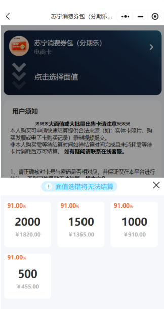 统一回收折扣为91.00%,这在大额卡券回收市场中,属于价格稳定且偏高的水平。尤其对于面额较大的卡来说,这一比例意味着用户可以快速回收大笔现金,避免闲置造成损失。
