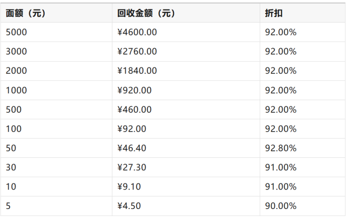 大多数面额集中在92%折扣,也就是说每100元卡大约回收92元;